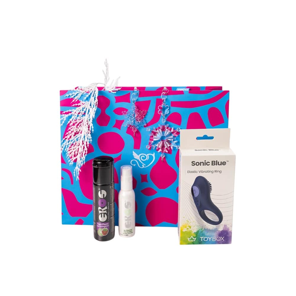This comprehensive pack features the TOYBOX Sonic Blue Vibrating Ring, engineered for powerful, shared pleasure with dual stimulation and 10 programs. Sweeten the experience with Eros Tasty Fruits Lubricant (Strawberry & Kiwi), a water-based, flavored formula perfect for oral play and smooth glide. Complete your set with the essential Eros All Purpose Toy Cleaner, an alcohol-free spray that keeps your toys pristine and safe. Everything you need for sensational, clean, and delicious holiday fun is right here.