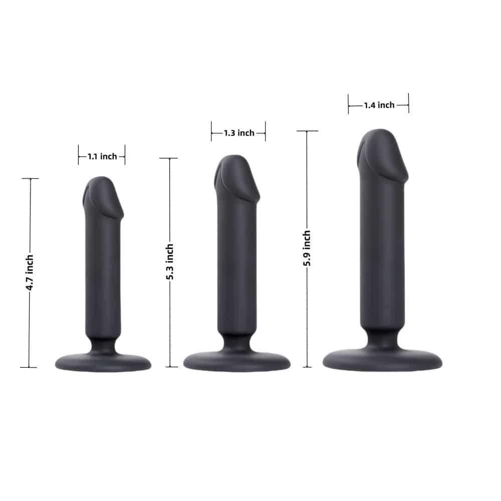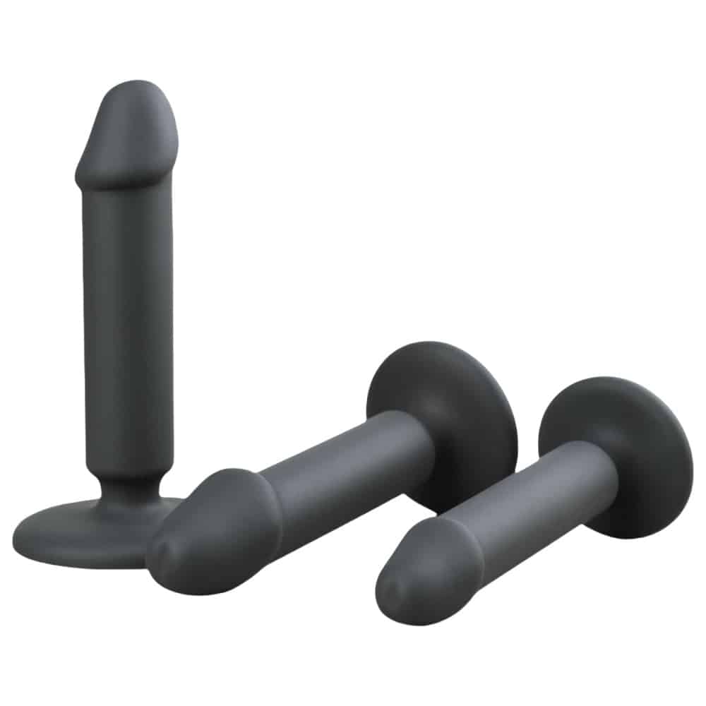 TOYBOY Black Trio silicone dildo Set with silicone dildos in different size options. Small, medium and large. Read more detailed dimension report, in product's main description page down below. No balls and act as butt plug dongs. Made with body-safe medical grade silicone. Soft touch and bendable. Each dildo plug curries a strong suction base cup for hands and mind free play. Ideal for anal or vaginal penetration-stimulation. Dildos are strap-on compatible too. Read and learn more at the product's main page below or visit one of our physical stores in Limassol and ask for product presentation..