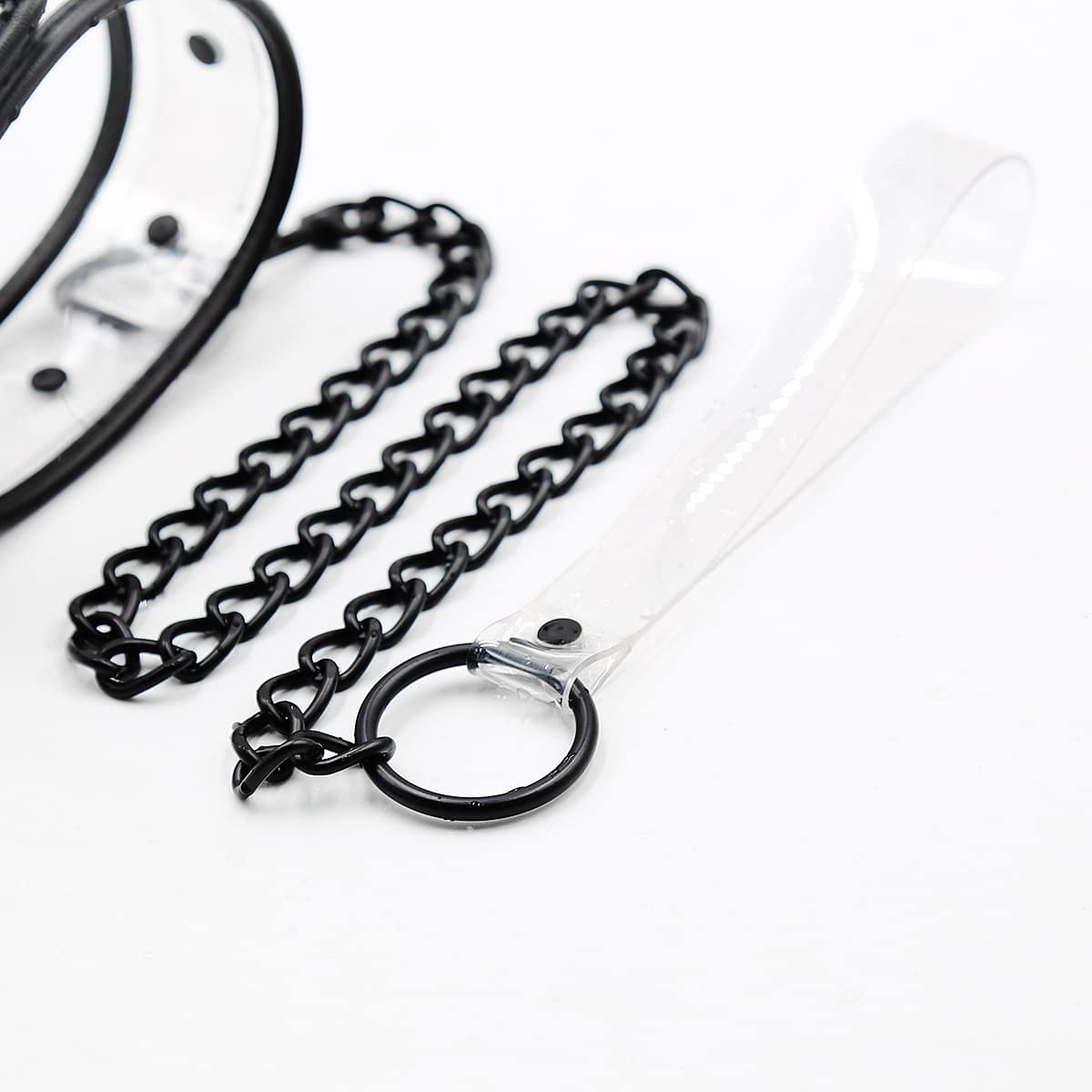 One size adjustable Transparent bdsm fetish playful collar and leash. Fully adjustable nickle-free hardware. Non-staining body-safe vinyl. Unisex design and compatiable with all Naughty Toys Bondage accessories