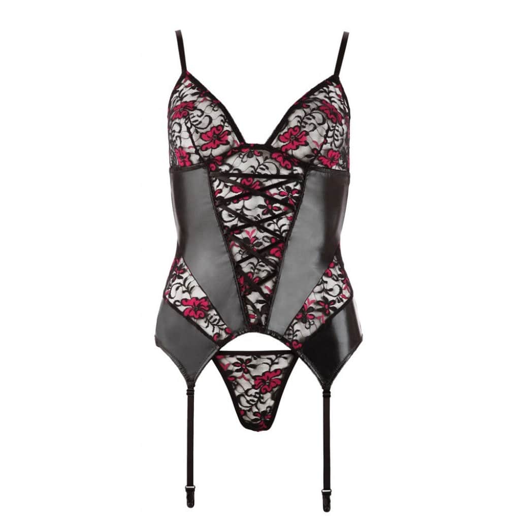 Black wetlook basque combined with lace in two different colours. The bra and 4 suspender straps are adjustable. With a hook-fastener at the back. Includes a matching lace string.