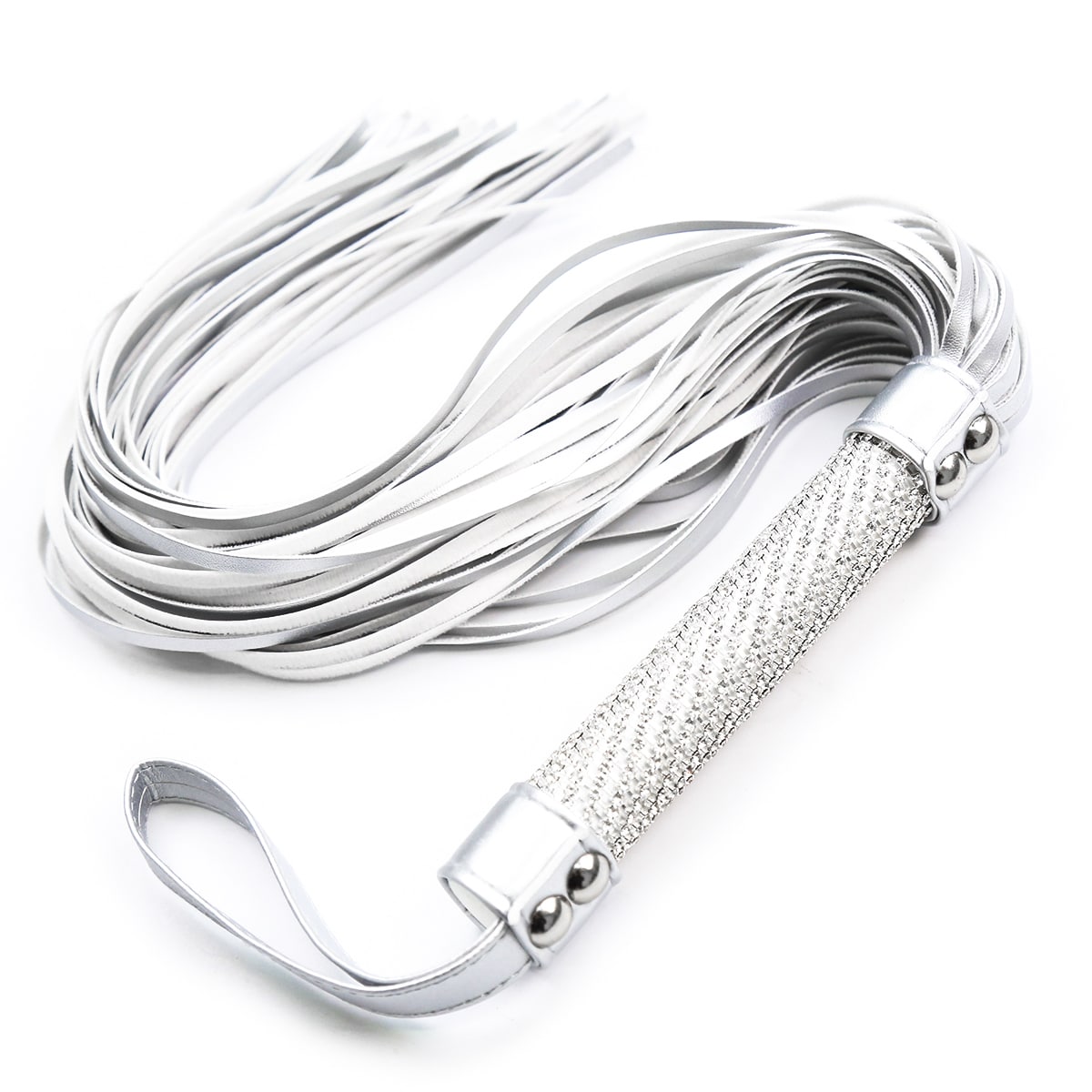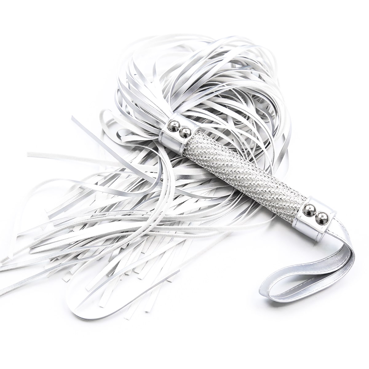 Naughty Toys White silverish imitation leather exclusive exotic design Bdsm Bondage flogger with white handle grip full of "crystal clear diamonds". The handle is almost covered completly with exotic embossed surface (diamond cut).