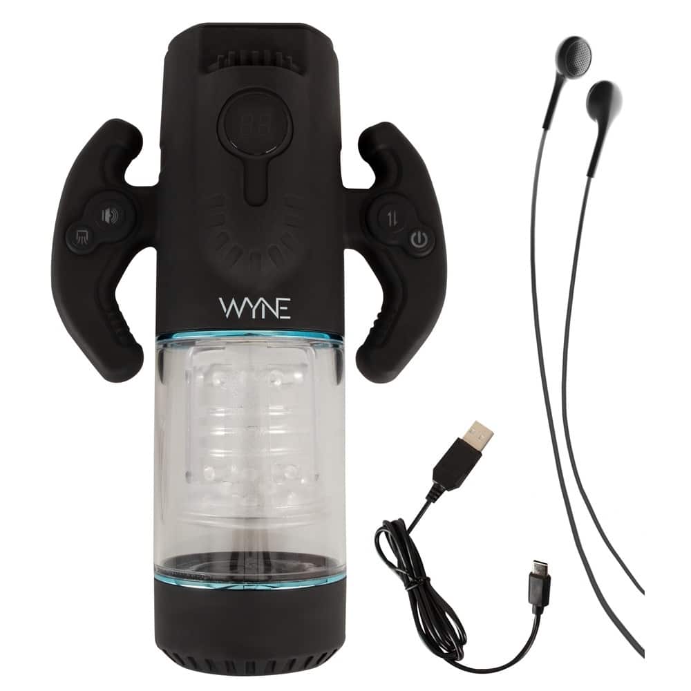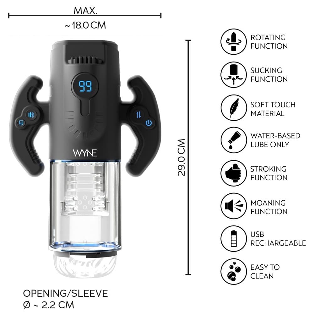 WYNE Masturbator II powerful masturbator for men. Elevate your pleasure with the WYNE Masturbator 11, a high-tech powerhouse featuring dual motors for simultaneous rotation, stroking, and suction. Designed to mimic realistic sensations, it offers 9 massage and 9 suction modes complemented by integrated moaning sounds via speaker or headphones for a truly immersive experience. With ergonomic handles, an intensely textured inner sleeve, and easy-to-clean parts, this fully automatic device delivers premium, customizable sensations at the touch of a button. FOR MORE PRODUCT INFORMATION, please, visit the main product's page down below or visit one of our physical stores in Limassol and ask our staff for product presentation…